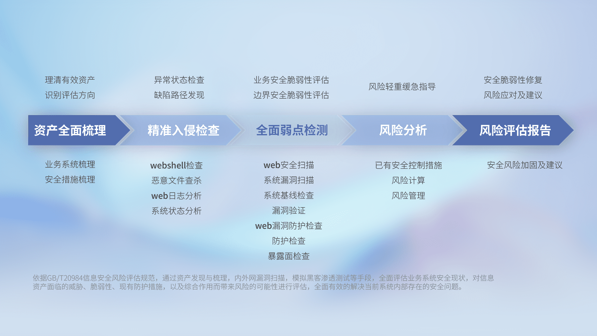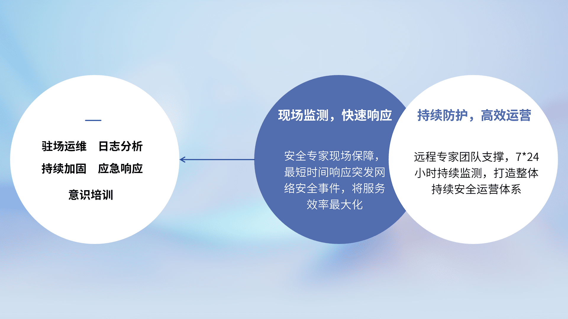 针对客户行业特性,,,以专业的安全服务+多厂商联合解决方案提供专属的一站式安全管理服务,,,帮助客户全面感知网络空间威胁,,基于识别、、检测、、、、分析、、、防护、、监测、、、响应的服务理论模型,,,从方案咨询、、、、集成交付、、、评估验证、、优化加固、、运维运营,,,,致力于为客户提供完整的闭环管理式安全服务。。以实战经验为客户打造高抵御风险的安全体系,,帮助客户发现威胁、、对抗威胁、、、、处置威胁,,,,不断积累安全对抗能力,,,,持续保障数字化安全。。。