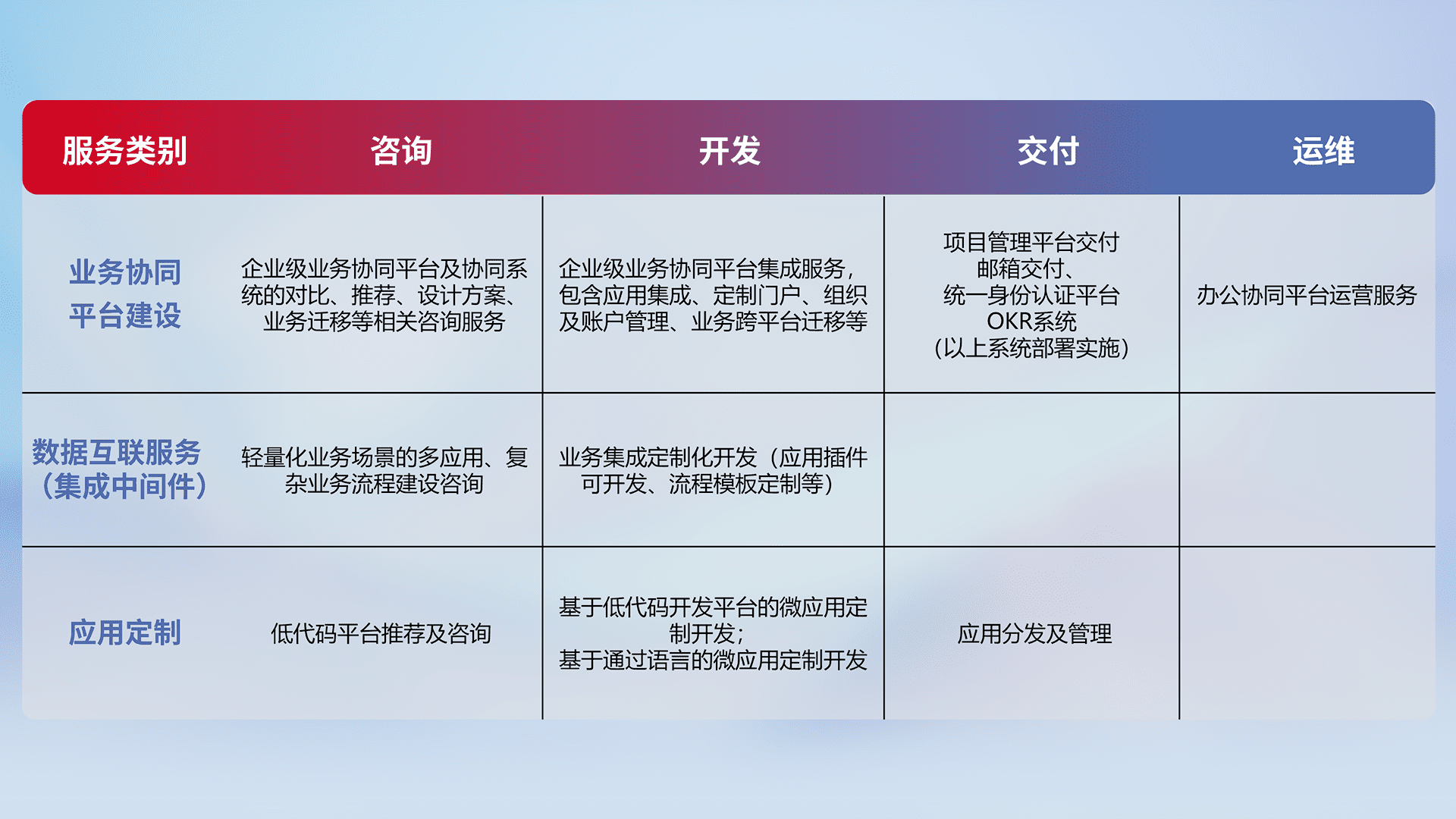 针对钉钉、、企微、、IDaas等平台级产品提供产品的规划、、方案、、、、交付、、、、定制化开发等服务,,实现如统一协同办公、、、智能客户服务、、混合会议管理、、智能数据查询、、、等业务场景,,实现数字化转型。。